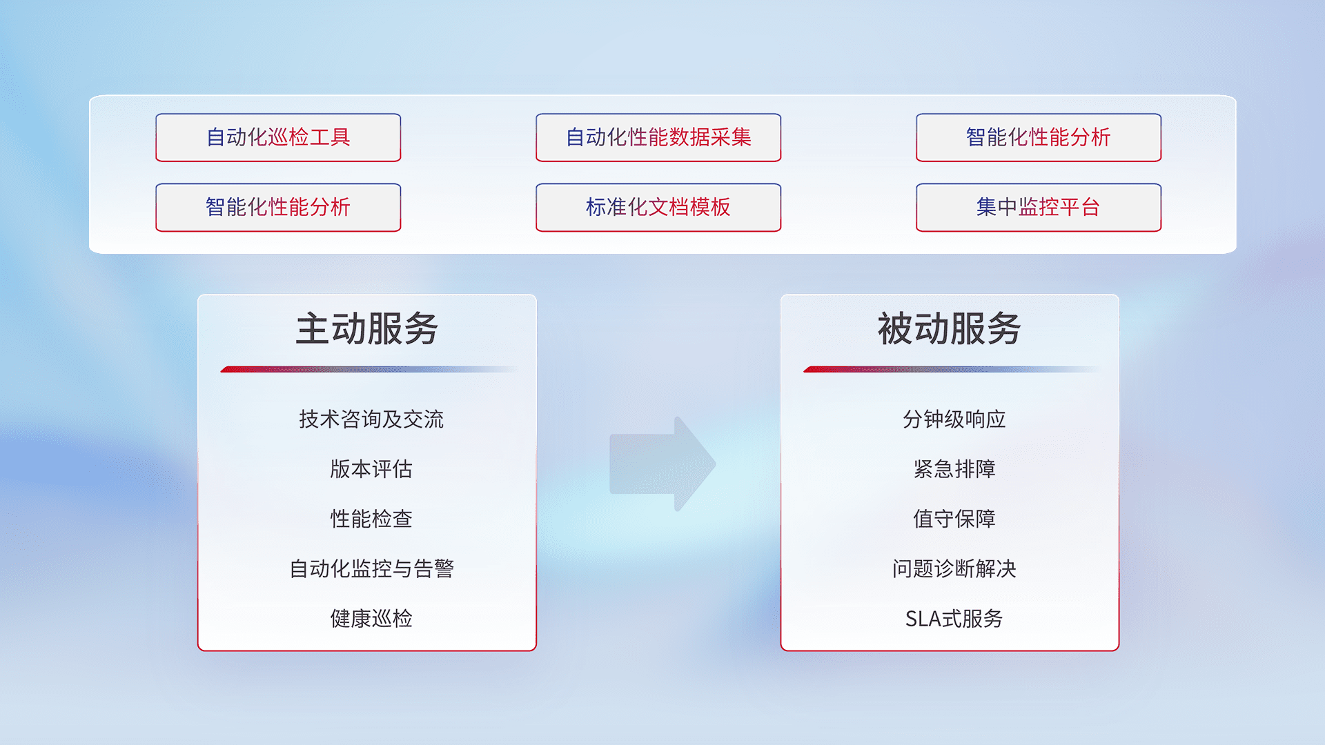 智能化工具和标准化文档,,,保障服务质量,,,提供主动服务(包含技术咨询、、版本评估、、、、性能检查、、、、自动化监控与告警、、健康巡检)和被动服务包含(分钟级响应、、、、紧急排障、、、值守保障、、、问题诊断解决、、、SLA服务)。。。