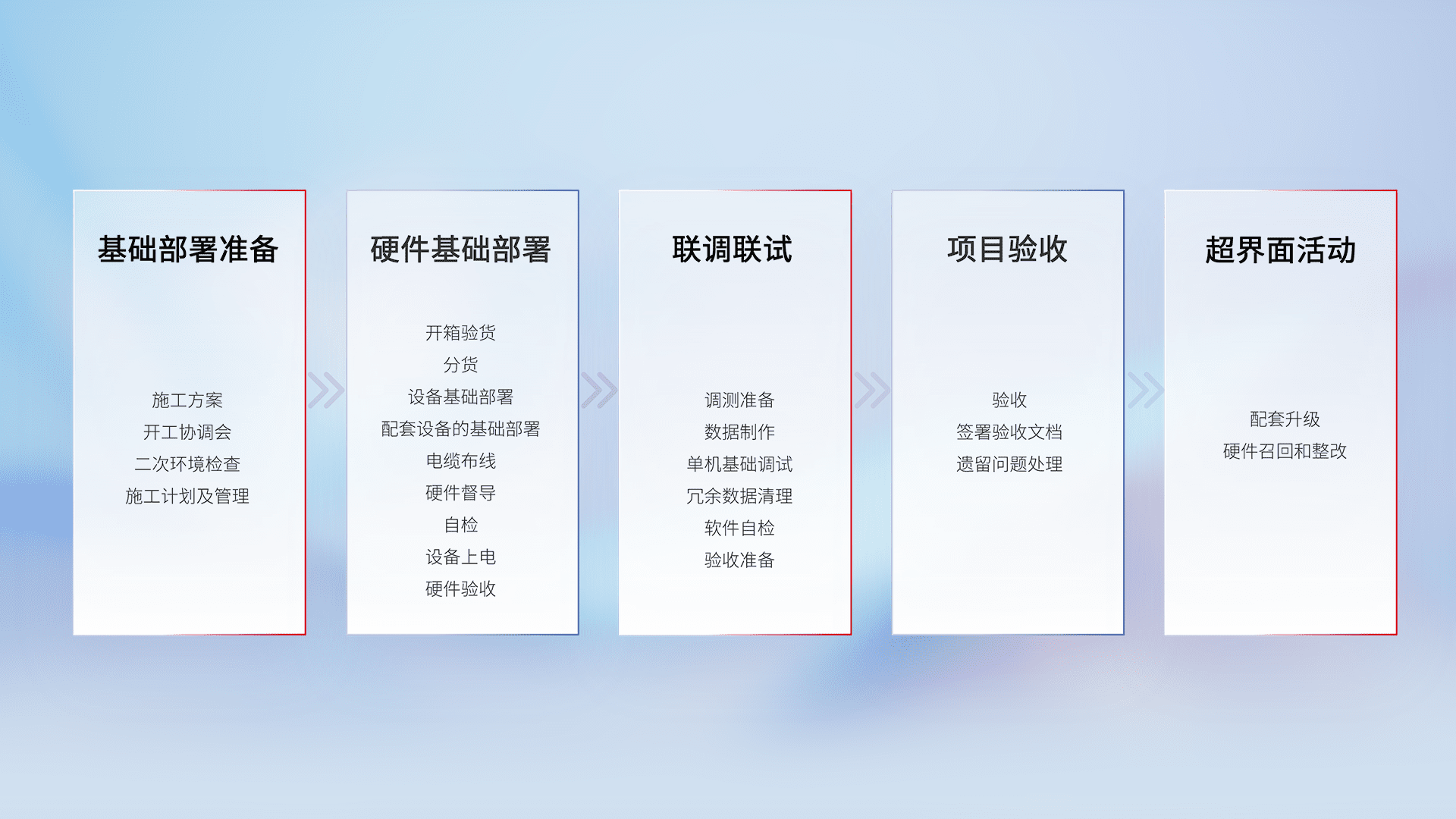 从基础部署准备、、、、硬件基础部署、、联调联试、、项目验收、、、、越界面活动的全过程可追溯,,,保证施工质量和进度。。。