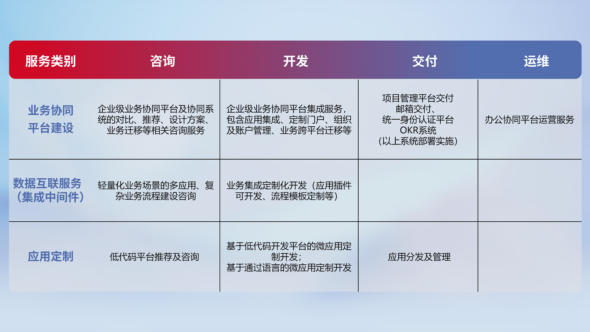 针对钉钉、、、、企微、、、、IDaas等平台级产品提供产品的规划、、、、方案、、交付、、、定制化开发等服务,,,实现如统一协同办公、、、智能客户服务、、混合会议管理、、智能数据查询、、等业务场景,,实现数字化转型。。。。